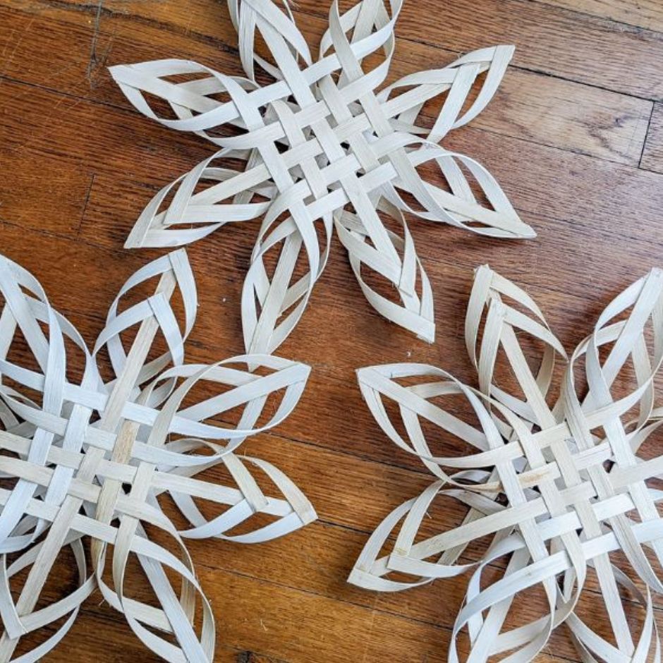 Create three beautiful Scandinavian-style woven snowflakes, each measuring approximately 16 inches in diameter — the perfect handmade accent for your holiday décor, window displays, or cozy winter spaces.